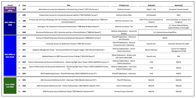The bookends of these surveys and studies evaluated in this article are, on the one hand, the narrowly focused, claims-oriented 1977 Lilly Survey produced at the genesis of the industry and, at the other end of the spectrum both in time and scope, the broadly expanded, plaintiff-focused 2025 MetLife Survey. Together, these studies define the scope of inquiry for this article, examining five decades of data to understand how structured-settlement research evolved, what it reveals about the profession today, and what questions remain for Parts Two and Three of this series to address.